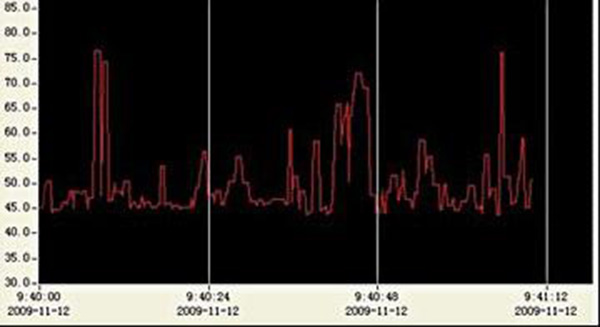 智能噪聲儀,采用數(shù)字化聲學分析測試儀為基礎進行連續(xù)測量(一般持續(xù)測量24小時),每間隔1.0s自動采樣記錄,并使用計算機讀取數(shù)據,繪制噪聲曲線(dB-h)。為了解城市輕軌鐵路噪聲對某小區(qū)影響的情況,,于2009年11月12日對某小區(qū)輕軌噪聲進行了12小時連續(xù)監(jiān)測,測點距輕軌直線距離70米。監(jiān)測統(tǒng)計結果如下