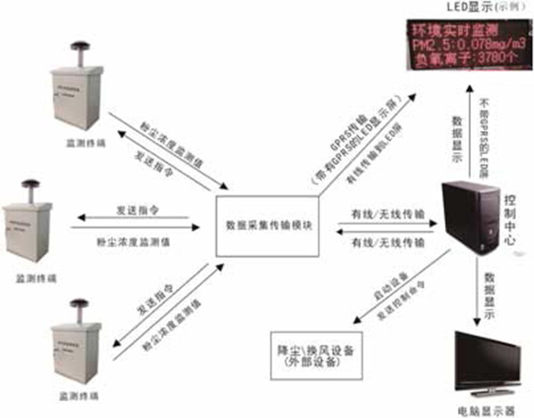本系統(tǒng)以有線232傳輸方式為紐帶,組建現(xiàn)場端到監(jiān)控平臺的一個城域網(wǎng),實現(xiàn)各監(jiān)控點與監(jiān)控平臺的連接。現(xiàn)場端設(shè)備按照國家相關(guān)技術(shù)協(xié)議將實時粉塵監(jiān)測濃度指數(shù)傳輸?shù)奖O(jiān)控平臺,監(jiān)控平臺對監(jiān)控數(shù)據(jù)進行存儲、統(tǒng)計、分析、處理,為重點區(qū)域環(huán)境管理提供數(shù)據(jù)支持和決策依據(jù)。