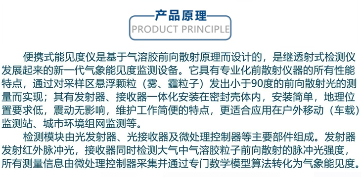 - 便攜式能見(jiàn)度儀是基于氣溶膠前向散射原理而設(shè)計(jì)的,是繼透射式檢測(cè)儀發(fā)展起來(lái)的新一代氣象能見(jiàn)度監(jiān)測(cè)設(shè)備。它具有專業(yè)化前向散射儀器的所有性能特點(diǎn),通過(guò)對(duì)采樣區(qū)懸浮顆粒發(fā)出小于90度的前向散射光的測(cè)量而實(shí)現(xiàn);設(shè)備發(fā)射器、接收器一體化安裝在密封殼體內(nèi),安裝簡(jiǎn)單,地理位置要求低,振動(dòng)無(wú)影響。
