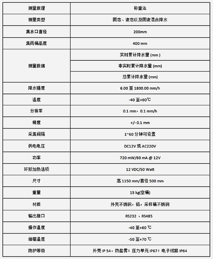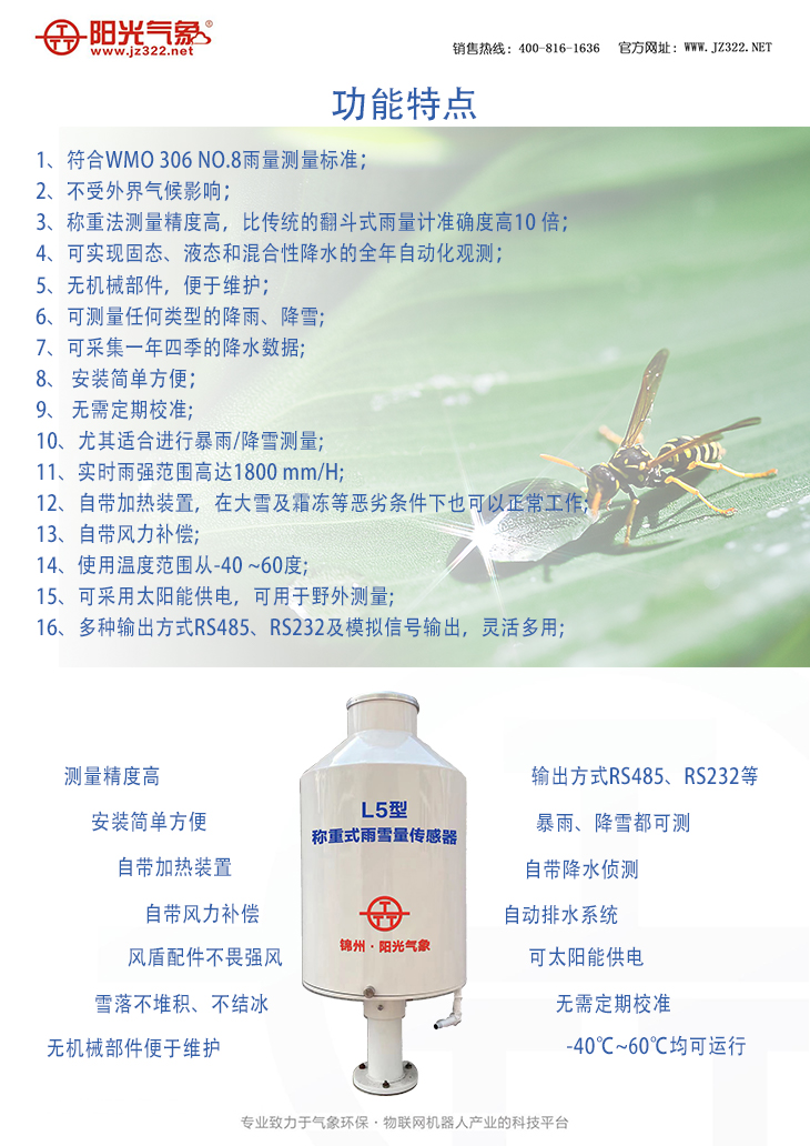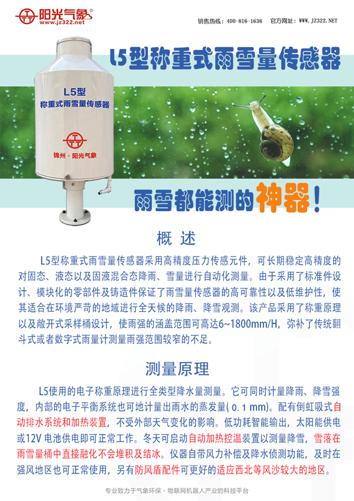- L5型稱重式雨雪量傳感器采用高精度壓力傳感元件,可長期穩(wěn)定高精度的對固態(tài)、液態(tài)以及固液混合態(tài)降雨、雪量進行自動化測量。由于采用了標(biāo)準(zhǔn)件設(shè)計、模塊化的零部件及鑄造件保證了雨雪量傳感器的高可靠性以及低維護性,使其適合在環(huán)境嚴苛的地域進行全天候的降雨、降雪觀測。該產(chǎn)品采用了稱重原理以及敞開式采樣桶設(shè)計,使雨強的涵蓋范圍可高達6~1800mm/h