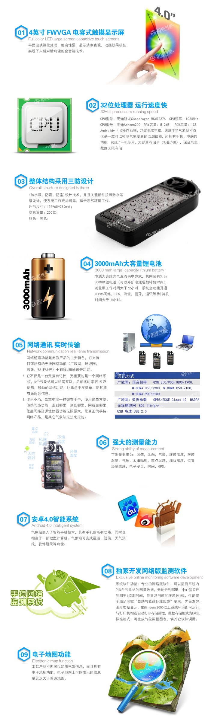 - 手持氣象站是我公司研發(fā)的新二代便攜式自動氣象站。主要用于便攜條件下實施氣象觀測。它具有測量精度高、穩(wěn)定可靠、體積小、重量輕、攜帶方便、可直接手持觀測等突出優(yōu)點。系統(tǒng)能自動測量環(huán)境溫度、濕度、露點、風速、風向、輻射、海拔和當前經(jīng)緯度等氣象要素。手持氣象站可自動儲存歷史數(shù)據(jù),內置大容量存儲卡,可連續(xù)存儲50年數(shù)據(jù),并通過電容式觸摸屏直接讀取實